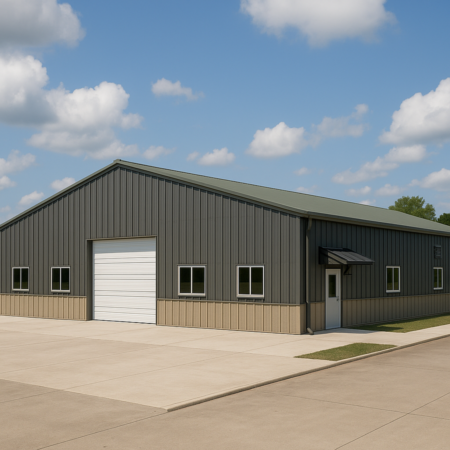 Grant’s 100x150 steel building in Utah is laid out in efficient 20′ structural bays for practical shop or storage use. The design adds a large insulated overhead door, a walk door with bolt-on metal canopy, multiple sidewall windows, and a painted metal wainscot. Inside, the roof and walls are fully insulated, while a wide concrete apron and clean interior slab support smooth circulation, parking, and equipment access.