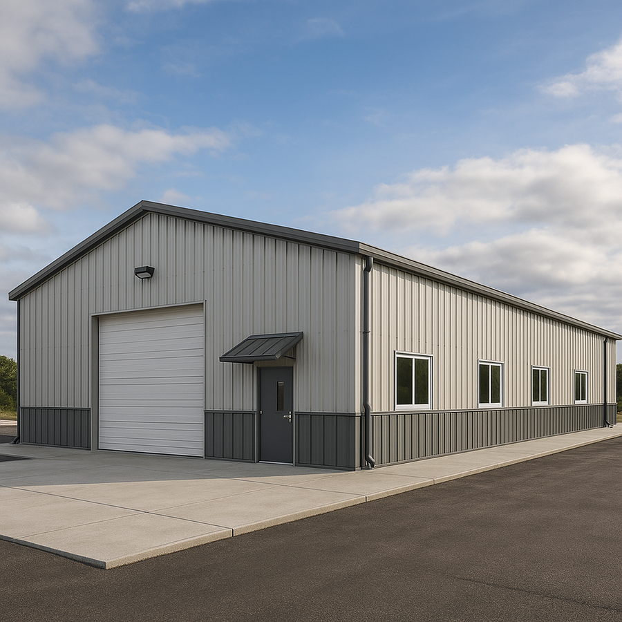 Sal’s 100×200 steel building in California is laid out with evenly spaced bays for long, clear interior spans, ideal for workshop or storage use. A large overhead door, walk door with protective metal canopy, multiple sidewall windows, gutters, downspouts, and painted metal wainscot add function, durability, and curb appeal.