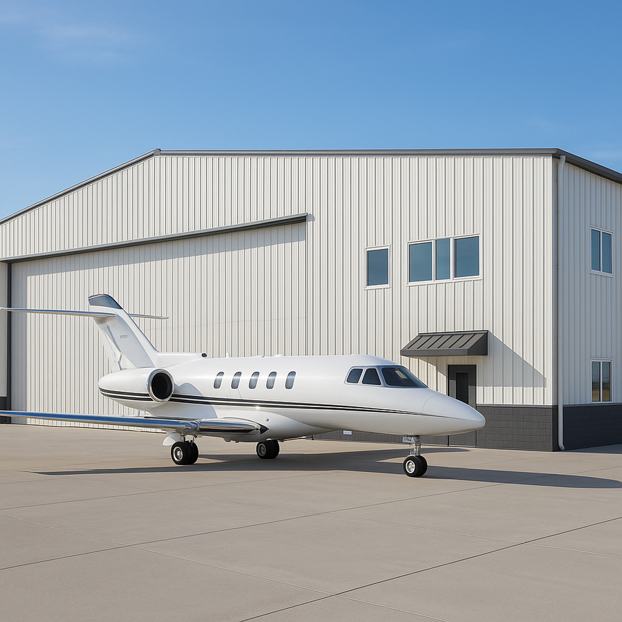 This 120x100 steel hangar in Wisconsin is tailored for jet and turboprop operations. A centered full-height hangar door maximizes clear opening, while a separate 3070 walk door with a metal canopy keeps crew traffic safe and dry. High sidewall windows bring in daylight, and dark metal wainscot, gutters, downspouts, and insulated roof and wall panels support all-season performance.
