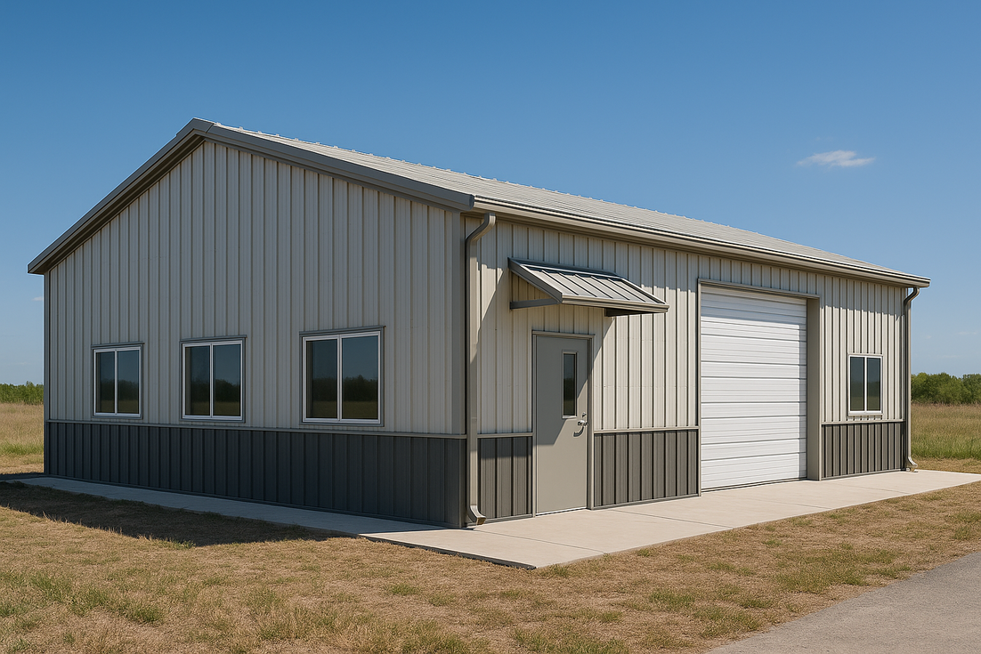Daniel’s 16x20 steel building in Arizona is optimized for a warm, sunny climate with light, reflective roof and wall panels, continuous gutters and downspouts, and a metal canopy over the main entry. Opposing wall windows encourage cross-ventilation and natural light, while a large overhead door with concrete apron simplifies vehicle and equipment access.