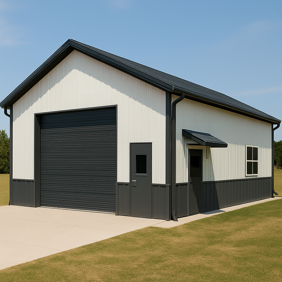 Chad’s 22x20 gable-roof steel building in Alabama is finished with Polar White wall panels and Charcoal Gray roof, trim, and wainscot to combat heat and add durability. A 12x12 overhead door, 3x7 walk door with glass lite, side window, and continuous gutters over a concrete apron create a versatile, weather-ready workspace that’s ideal for everyday use.