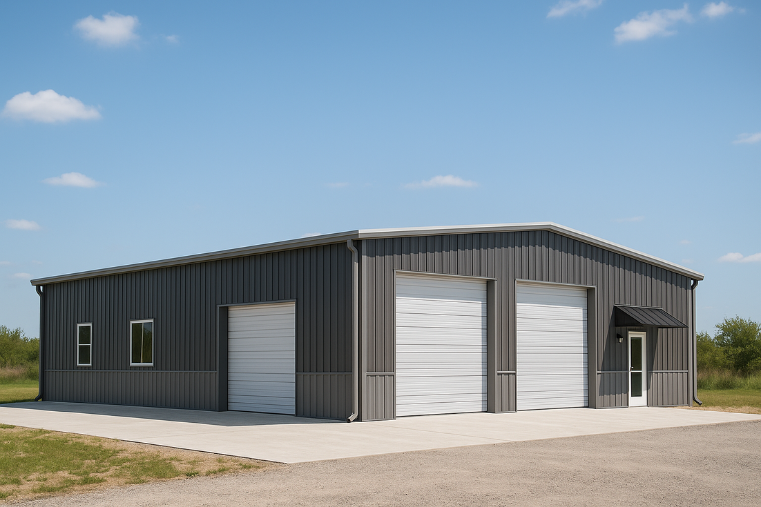 Marsha’s 22x30 metal workspace in Maine is tailored for warm, sunny conditions with multiple large overhead doors on the primary elevation, a bolt-on canopy over the walk door, and continuous gutters and downspouts that help keep the concrete apron dry. Insulated roof and wall systems, darker vertical wall panels, light-colored doors and roof, and a side window all work together to control heat gain while brightening and ventilating the compact interior.