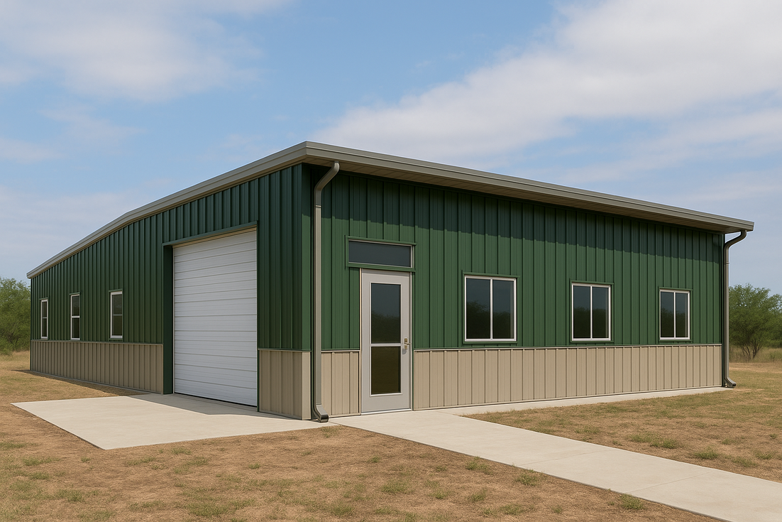 Carl's 24x40 metal building in North Dakota is shown at full scale, with a light, reflective roof, full gutters and downspouts, and a durable painted metal wainscot. A large overhead door, centered man door with transom, concrete apron and walkway, and multiple windows create a bright, accessible workspace that’s ideal to insulate for year‑round comfort.