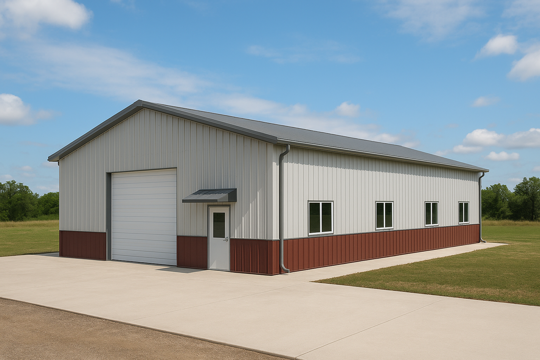 Paul’s 30x40 metal workshop in Arkansas features a stretched sidewall layout with realistic panel rhythm, light roof and wall panels, and a dark metal wainscot to protect the lower walls. Continuous gutters and downspouts, wall and roof insulation, multiple sidewall windows, and a large overhead and walk door over a full concrete apron create a bright, comfortable, four-season workspace.