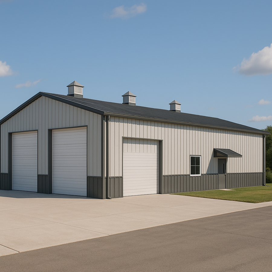 Cyanna's 30x40 metal building in California is a four-season workspace featuring insulated roof and wall panels, multiple drive-through overhead doors, a separate walk door with a protective canopy, roof cupolas, continuous gutters with downspouts, and a durable darker metal wainscot over a full concrete slab and apron.