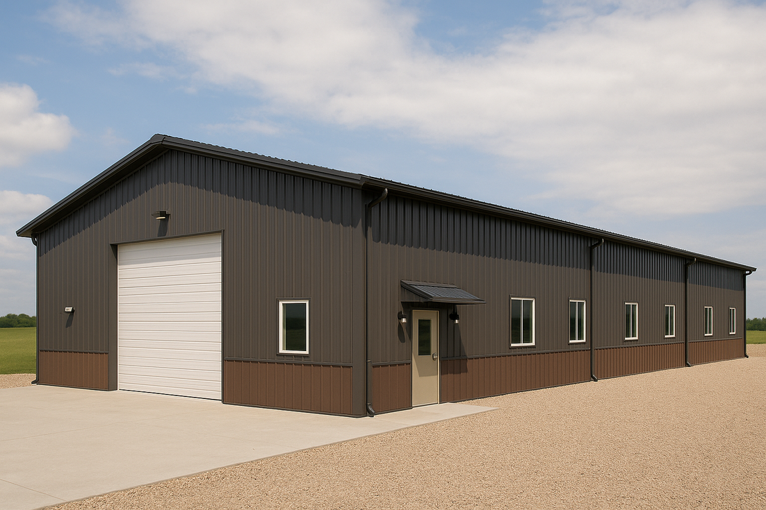 Scott's 30x40 steel building in Illinois was tailored for four‑season performance with continuous gutters and downspouts, a protective metal wainscot, an upgraded entry canopy and exterior lighting, strategically placed windows for light and cross‑ventilation, and insulated interior liner panels for comfort and efficiency.