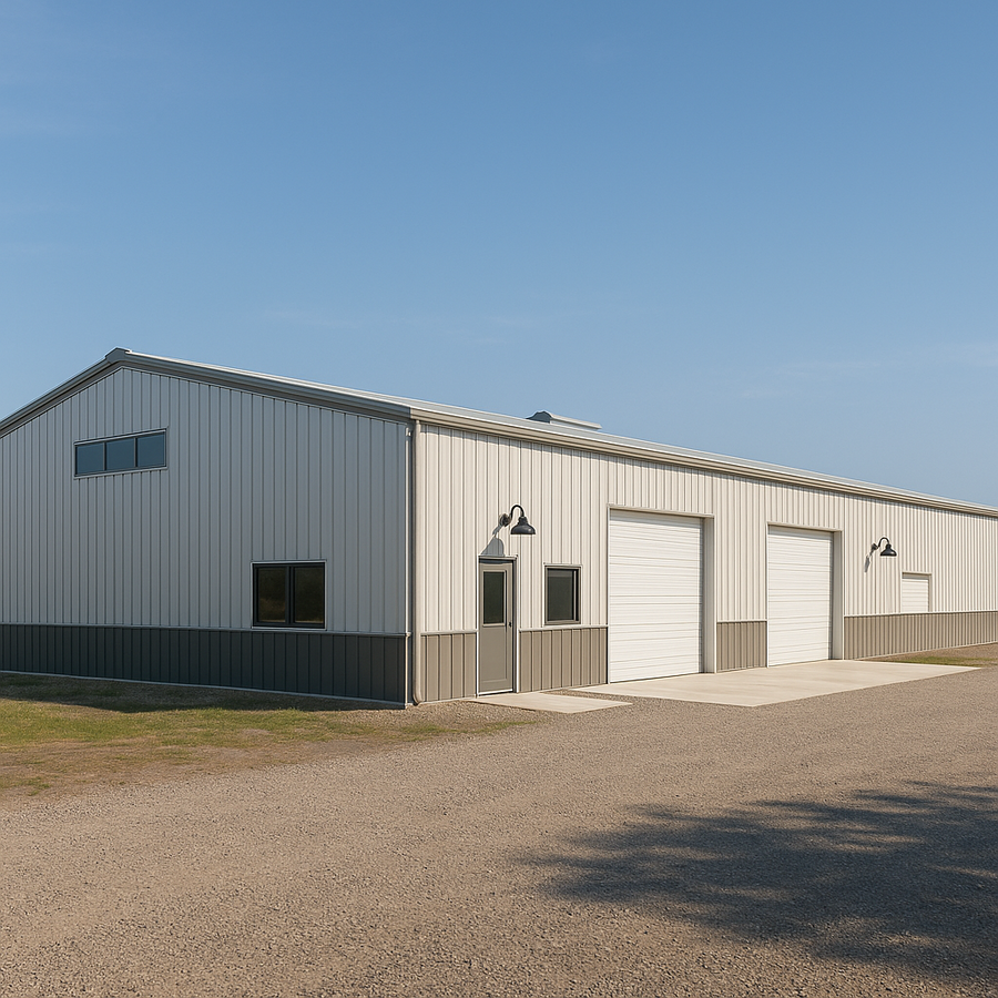Troy’s 30x40 metal building in Maine is designed for warm‑weather comfort and everyday function. Light-colored roof and wall panels boost solar reflectivity, while a continuous ridge vent and operable windows on every wall support natural cross‑ventilation. Two overhead doors open to a concrete apron for vehicle and equipment access, complemented by a metal walk door, roof insulation, and a two‑tone metal wainscot for added durability and curb appeal.