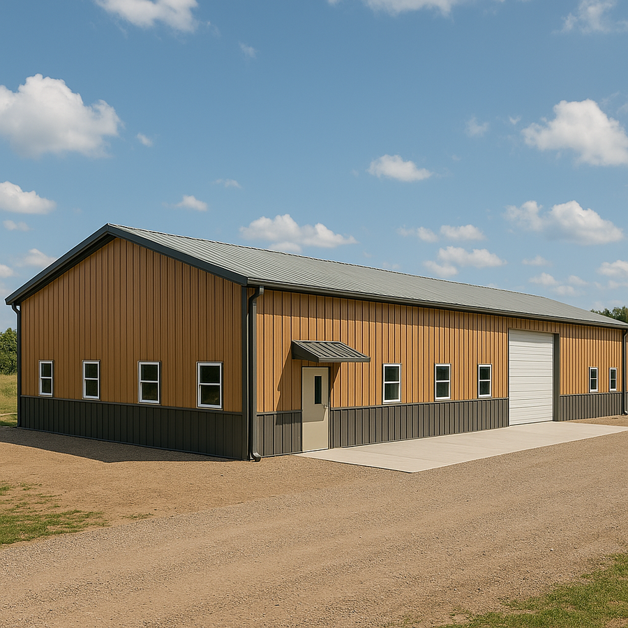 Daniel’s 30x50 metal workshop in Arizona keeps the original footprint but upgrades the envelope for four-season use with a light, reflective roof, R-19 wall and R-30 roof insulation. Continuous gutters and downspouts, metal wainscot, and a bolt-on canopy protect the exterior, while windows on three sides and bright interior liner panels create a clear, usable workspace.