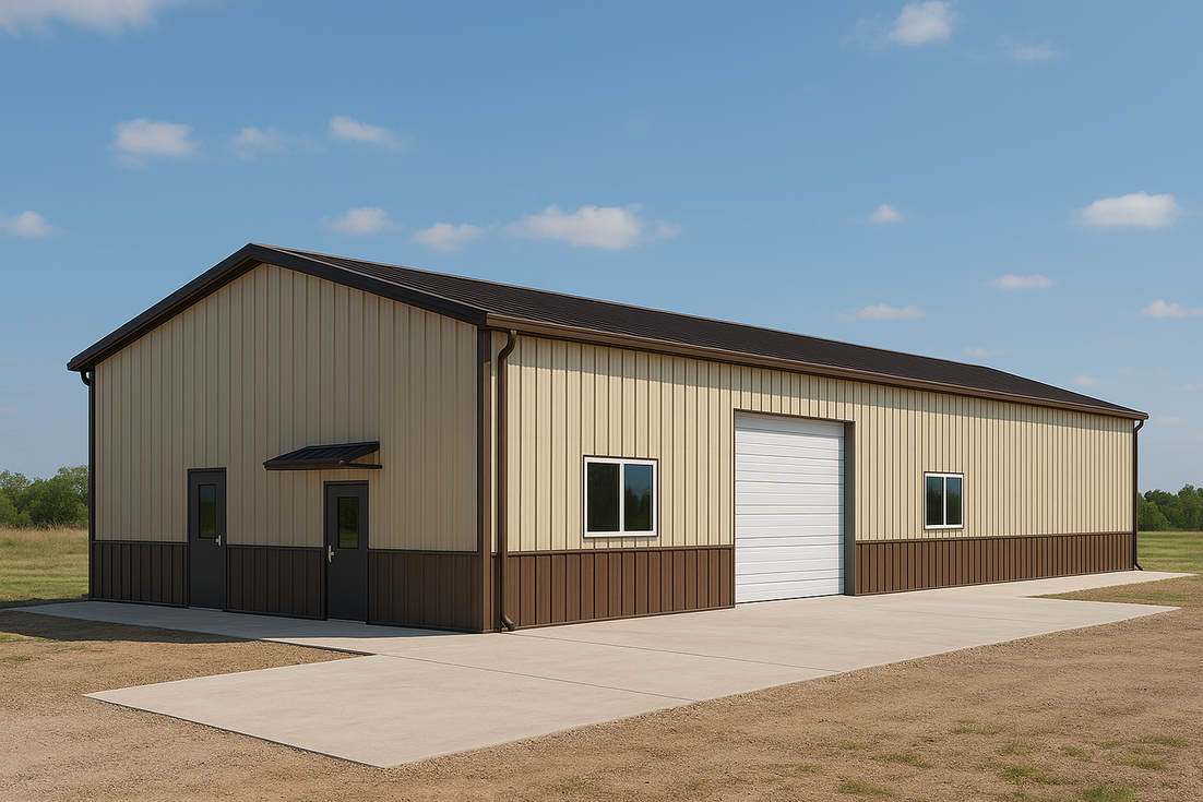 Max's 30x50 steel workshop in Kansas stretches the full footprint for everyday shop and storage use. The building features a two-tone metal wainscot, dark roof, continuous gutters and downspouts, and a concrete apron at the overhead door for clean vehicle access. Paired windows on the sidewall and gable ends, insulated roof and wall panels, and a bolt-on canopy at the walk door improve comfort, light, and ventilation year-round.