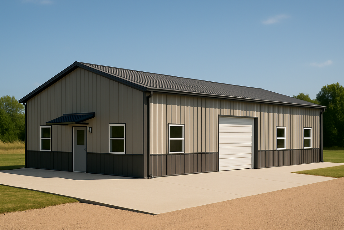 This 30x50 gable steel building in Louisiana is tailored as Bobby’s year-round workshop, featuring a protected walk door with bolt-on canopy, an 8'x8' sectional overhead door, multiple daylighting windows, dark metal wainscot, a full concrete apron and walkway, plus gutters and downspouts ready for high Gulf Coast rainfall.