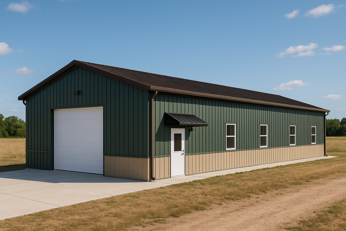 Darrell’s 30x50 metal building in Ohio is finished as a versatile workshop and garage with a centered overhead door, side walk door under a bolt-on metal canopy, continuous gutters and downspouts, and vertical siding with contrasting metal wainscot plus sidewall windows for light and ventilation. Inside, a clear-span frame and clean liner panels keep the floor plan flexible.