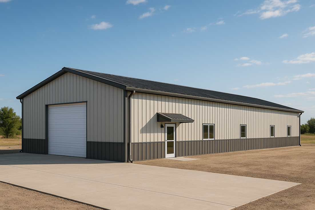Rodrigo’s 30x55 metal building in Texas is laid out with the main work zone along the long wall, featuring a wide overhead door with concrete apron, a side-entry metal walk door under a bolt-on canopy, multiple windows for light and ventilation, continuous gutters and downspouts, and roof blanket insulation with recommended wall insulation to R-11–R-19.
