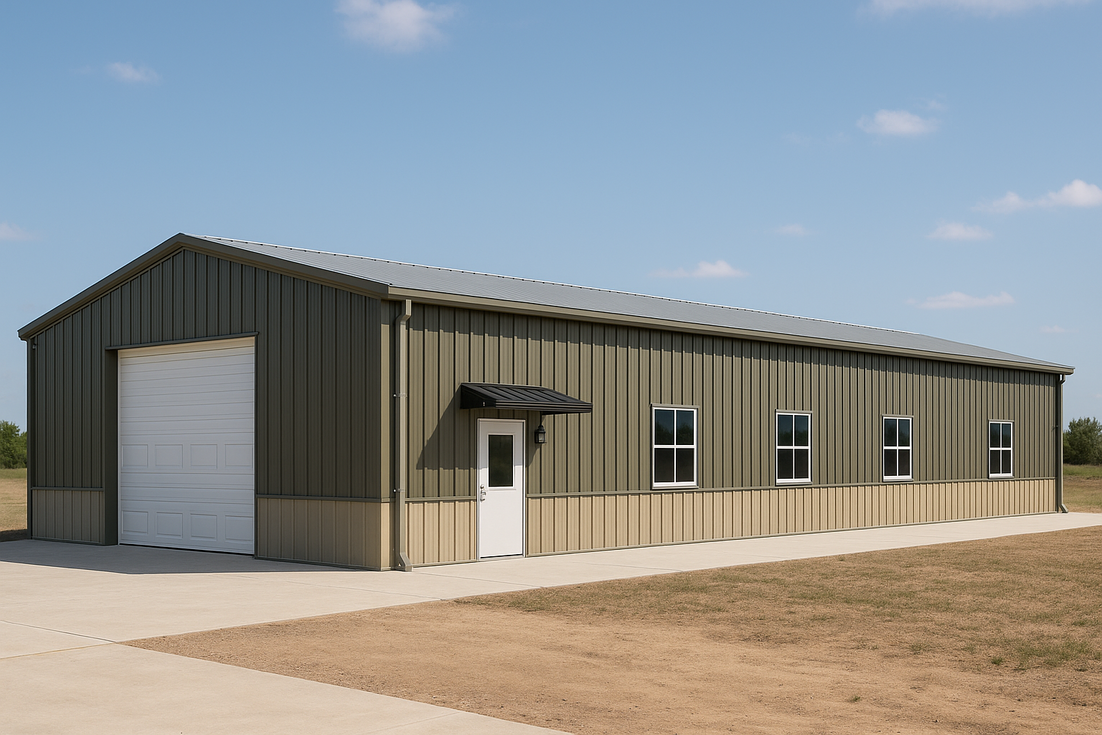 Neville’s 30x60 steel building in Texas keeps the full clear-span footprint while stretching the elevations so panel spacing, windows, and doors align cleanly along the long wall. A light, reflective roof color, sidewall windows, and limited gable-end glazing help manage heat. The design includes a 12´x12´ overhead door, insulated 3070 walk door with black metal canopy, metal wainscot, and roof insulation, with additional R‑11 to R‑19 for energy efficiency.