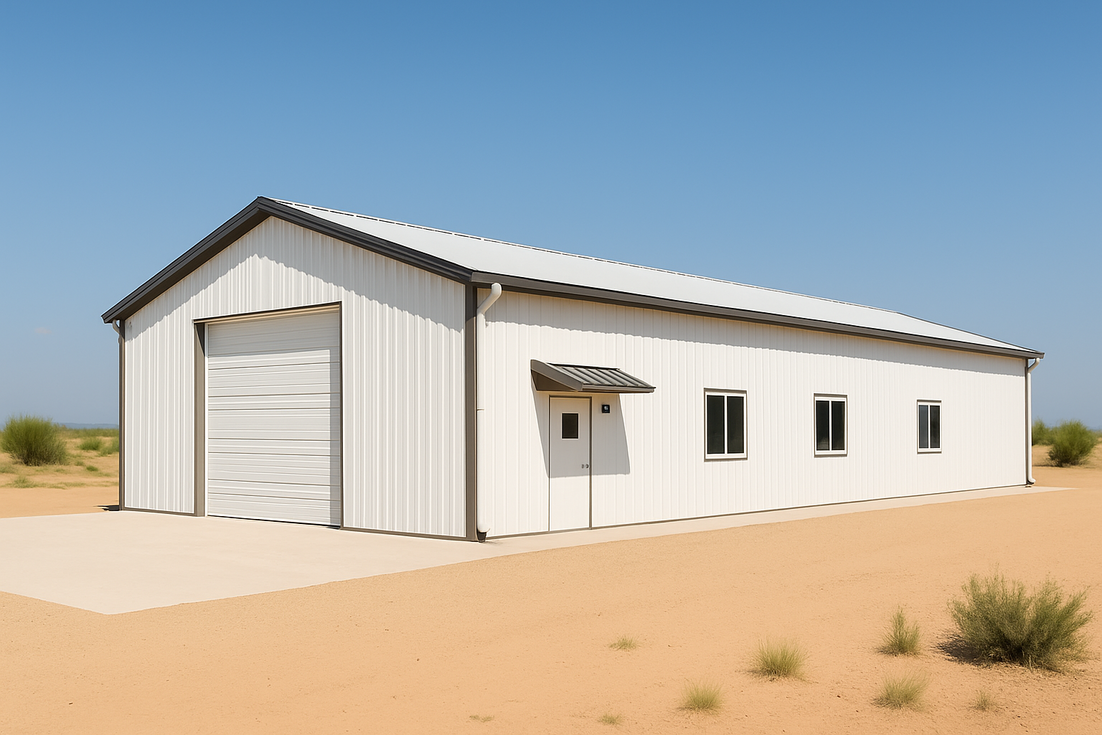 Daniel’s 30x80 steel building in New Mexico is optimized for hot, sunny desert conditions with a reflective Polar White roof and walls and a dark metal wainscot for visual contrast. A continuous gutter and downspout system protects the concrete apron, while an entry canopy and grouped sidewall windows enhance comfort, light, and cross-ventilation inside the clear-span space.