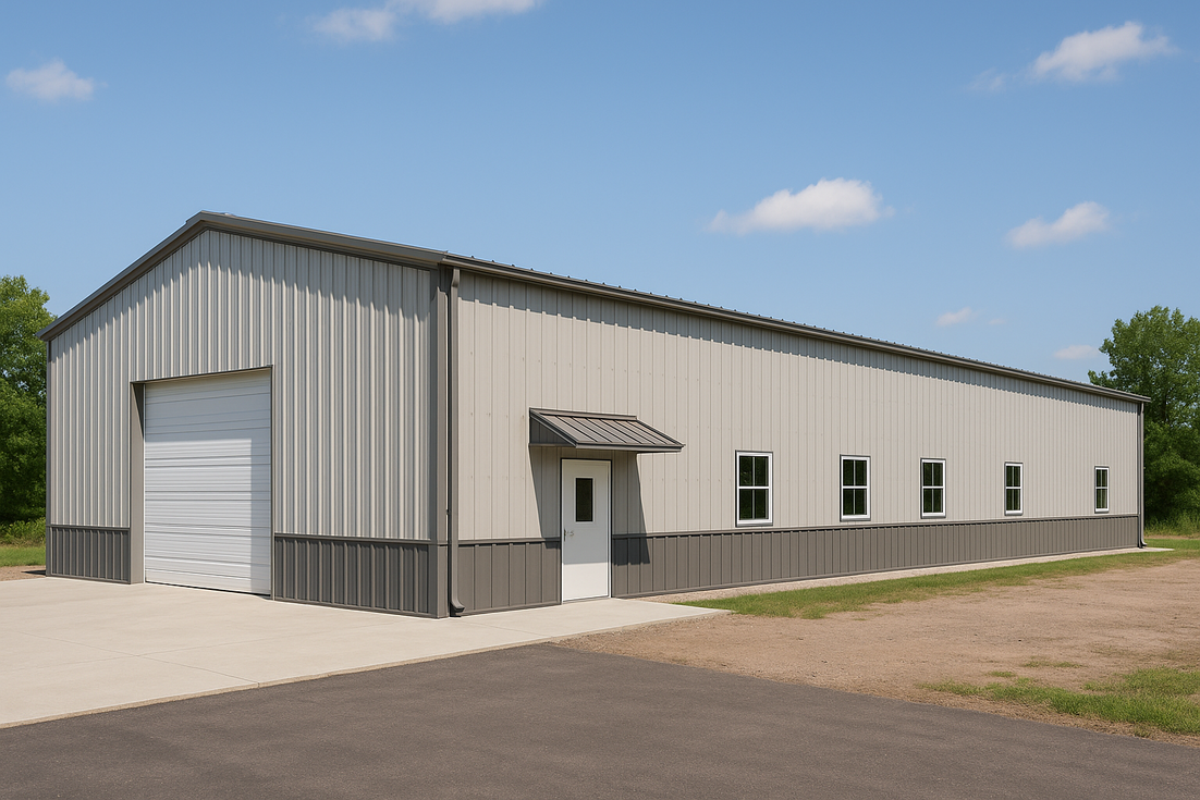This 30x90 steel building in New York was stretched to its full footprint with panel rhythm and window spacing tuned to the long sidewall. A tall overhead door, walk door with bolt-on metal canopy, and two-tone metal wainscot support rugged workshop and storage use. Continuous gutters and downspouts, light-colored panels, and optional R-19 wall/R-30 roof insulation keep it comfortable in four-season weather.