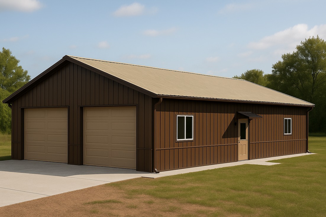 Michael’s 36x40 gable-roof steel building in California is customized as a bright, durable workshop and garage. Dual 8'x8' overhead doors, a covered man door entry with a small metal canopy, added sidewall windows, continuous gutters and downspouts, and a defined concrete walkway create an efficient, all-metal space ready for insulation and four-season use.