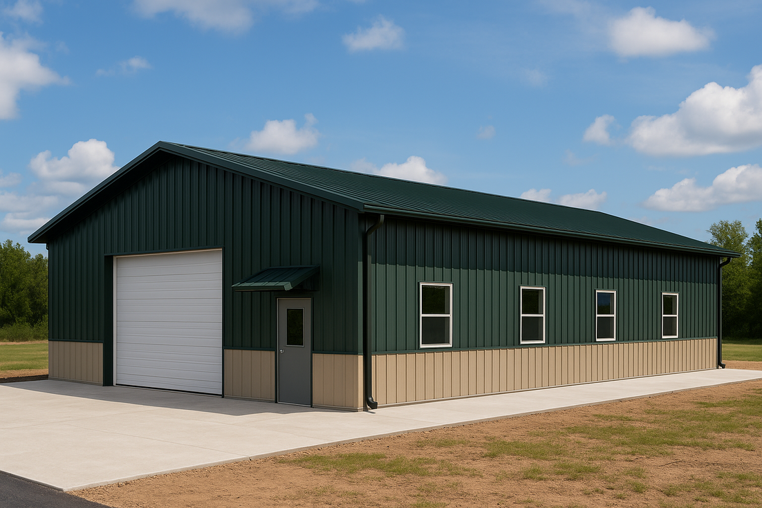 Designed for cold-climate performance, Gordon's 36x50 steel building in Oregon serves as a versatile workshop and storage space. Upgrades include a full concrete apron, large overhead door, metal walk door with canopy, continuous gutters and downspouts, two-tone metal wainscot, and bright interior liner panels ready for insulation.