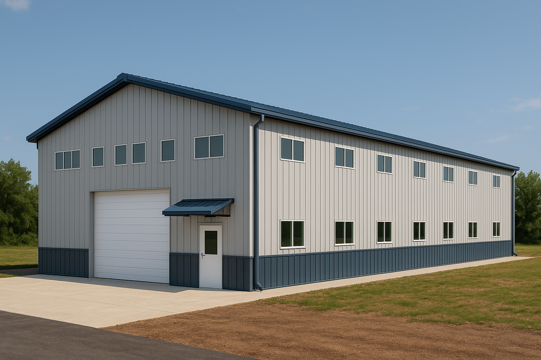 David’s 38x70 steel building in Florida is a clear-span building design for flexible workshop or storage use. The exterior features durable painted metal wainscot, contrasting roof trim, continuous gutters and downspouts, a large overhead door, and a walk door under a protective canopy. Long rows of sidewall windows and clerestory glazing flood the interior with light, while insulated roof and wall systems with liner panels and a polished concrete slab support the structure.