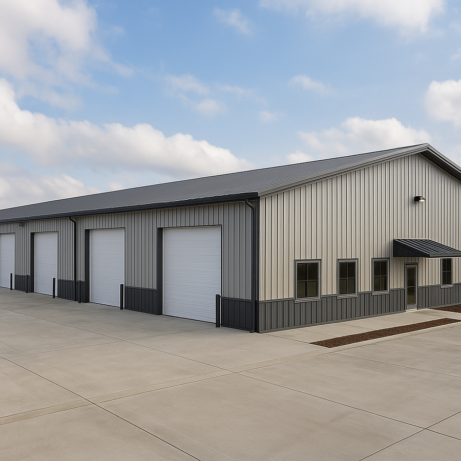 Anthony customized this 40×100 steel building in Utah with four oversized overhead bays, continuous metal wainscot, and a bold dark‑roof/light‑wall color scheme. A bolt‑on canopy shelters the walk door and windows, while continuous gutters and downspouts protect the long walls. Inside, an insulated roof, tall overhead door with vision panels, and multiple windows keep the shop bright and comfortable year‑round.