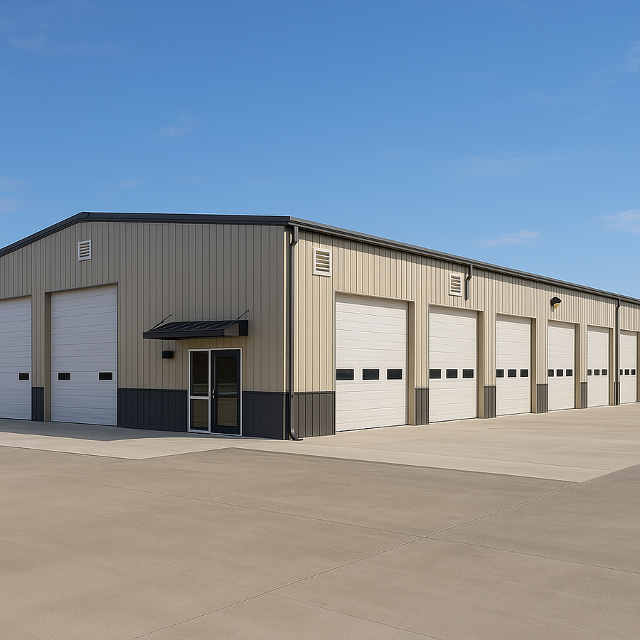 Avery’s 40x120 steel building in Utah stretches the full footprint with repeating overhead door bays along the working side for efficient vehicle flow. Oversized insulated doors with vision panels, a glazed entry under a slim metal canopy, and a dark metal wainscot boost function and durability, while wall louvers, gutters, and a fully insulated interior create a bright, comfortable workspace.