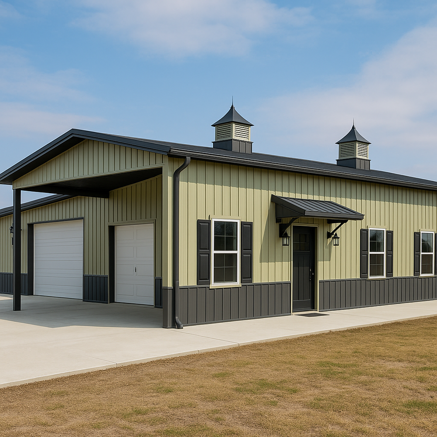 Trenity’s 40x60 barndominium in Mississippi combines everyday living and flexible work space in a clear-span steel shell. The exterior showcases two-tone vertical metal siding with a darker wainscot, a residential-style entry door under a metal canopy, and multiple windows with shutters. Twin metal cupolas, continuous gutters and downspouts, and insulated-ready framing prepare this building for efficient, year-round use.
