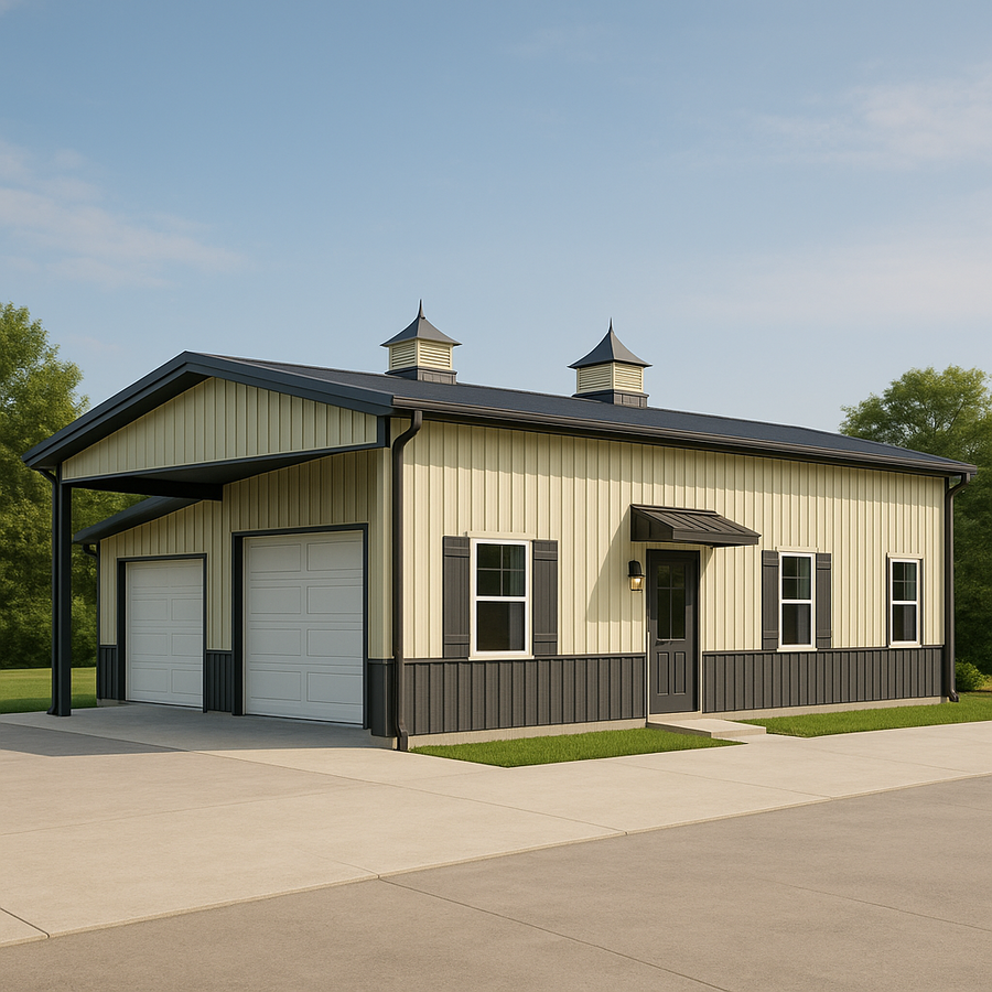 Tyler's 40x60 metal barndominium in New Mexico uses a clear-span steel frame to keep the interior wide open for flexible living and shop space. A covered lean-to shelters the overhead doors, while a bolt-on entry canopy, twin roof cupolas, gutters, downspouts, and insulated wall and roof panels add comfort, drainage control, and curb appeal.