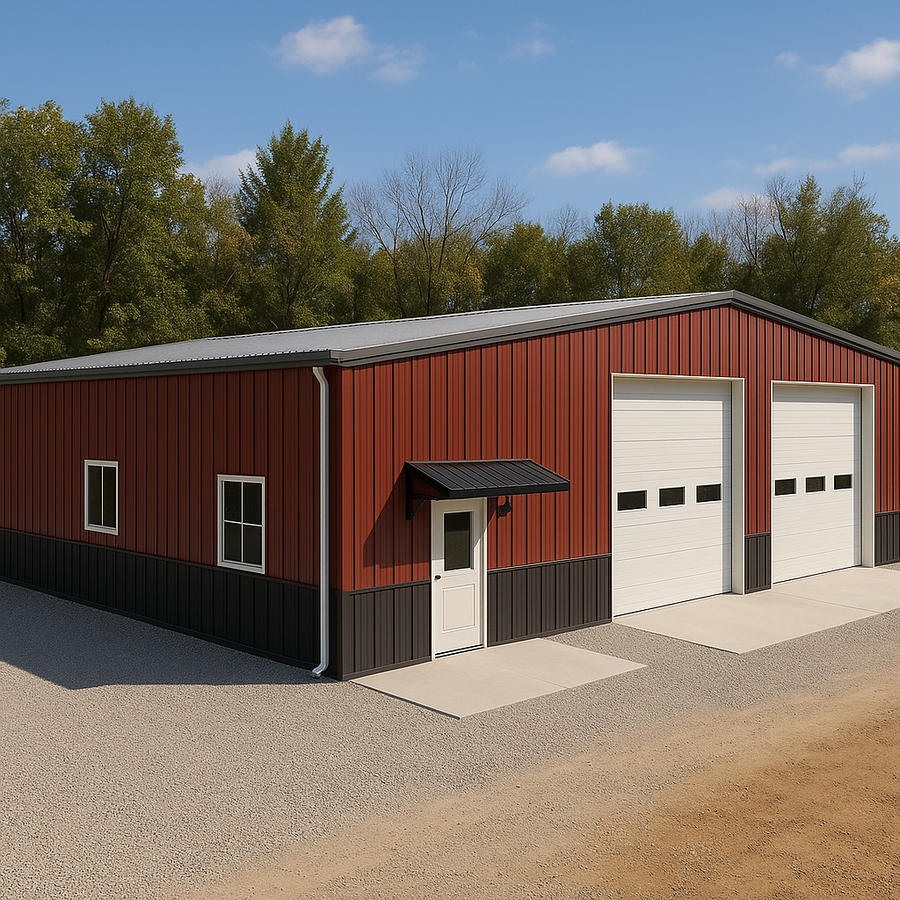 Robert's 40x60 metal garage in Tennessee is designed for everyday use and comfort, with dual insulated overhead doors, multiple windows for light and airflow, a covered metal walk door entry, full roof and wall insulation, gutters and downspouts, and a smooth concrete slab with durable contrasting wainscot panels.