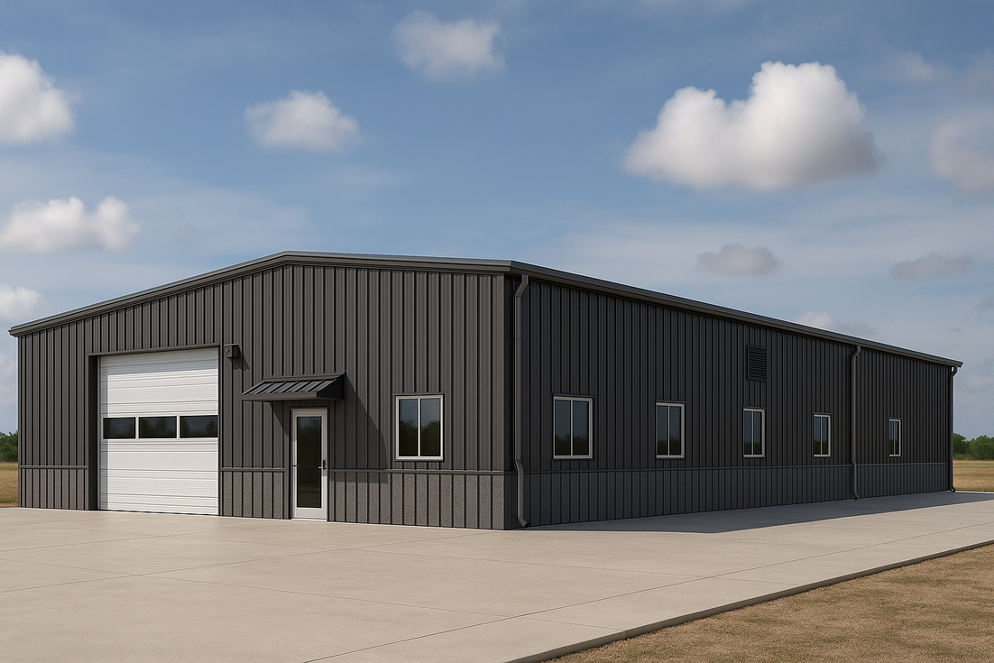This 40x60 clear-span steel building in Texas is engineered for four-season performance with continuous gutters and downspouts, a metal canopy over the walk door, and a full concrete apron at the overhead door. Insulated wall and roof panels, multiple windows, and a wall louver balance natural light, ventilation, and energy efficiency.
