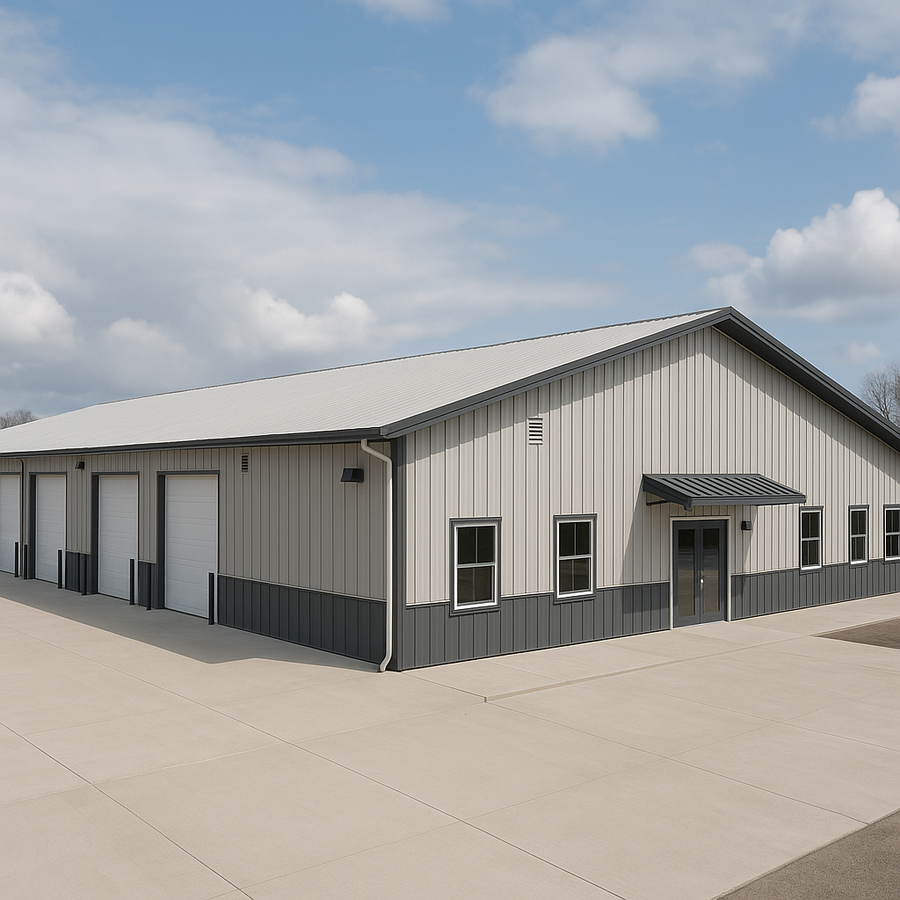 Marty’s 40x80 steel building in North Dakota is engineered for all‑climate performance with a light, reflective roof, two‑tone vertical wall panels, and a defined main entrance under a bolt‑on metal canopy. Three overhead doors along the side open to a wide concrete apron, while gutters, downspouts, windows, and a gable vent support drainage, natural light, and ventilation.