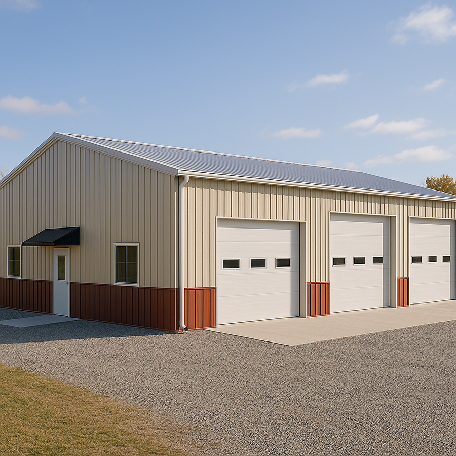 David’s 48×36 steel garage building in Maryland is laid out with three 12' front bays, each served by an insulated sectional overhead door on a full concrete apron for clean, easy access. A dedicated walk door with a bolt-on metal canopy and sidewall windows improves everyday usability. Two-tone metal siding with a durable wainscot, a light reflective roof, and continuous gutters and downspouts complete this all-season ready layout.