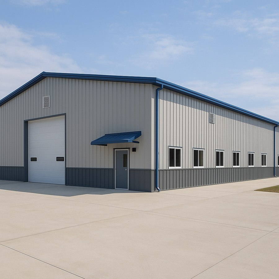 Stephen’s 50×100 steel building in Colorado is stretched to its full footprint with a continuous concrete apron for smooth vehicle access, a dedicated walkway to the insulated walk door, and a bolt‑on metal canopy at the main entrance. Continuous gutters and downspouts protect the slab, while evenly spaced windows and wall louvers improve daylighting, cross‑ventilation, and everyday usability.