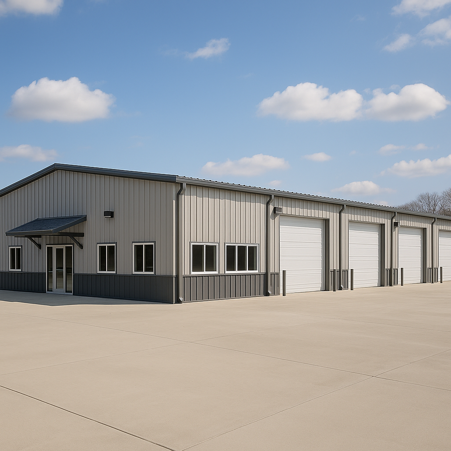 Tom’s 50x100 metal building in Colorado combines a multi-bay shop with a clean front office. Four large overhead doors span the long wall for flexible vehicle and equipment access, while a covered glass entry and continuous windows define the office side. Light-colored insulated panels, gutters, downspouts, and a full concrete apron support efficient, four-season use.