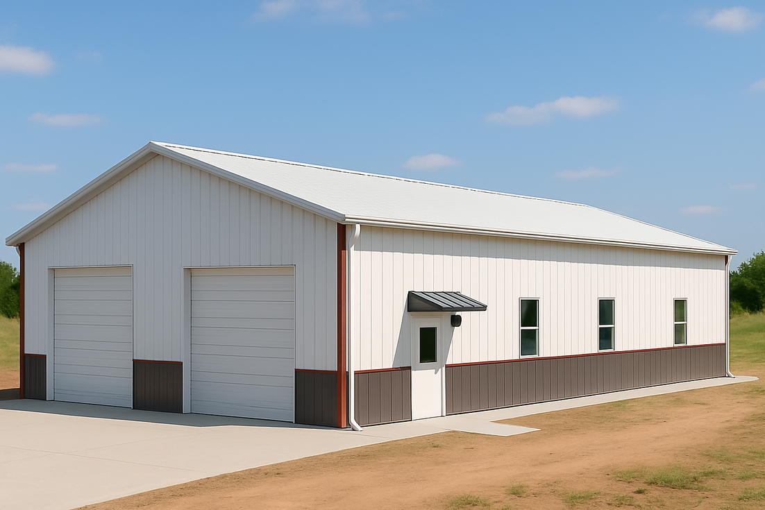 Nathan’s 50x40 gable steel building in Arkansas features Polar White roof and wall panels tuned for hot summers, with dark wainscot protecting the lower walls. Two 10x10 overhead doors, a 3x7 walk door with metal canopy, and widened concrete apron and walkways improve access, while sidewall windows and full gutters and downspouts enhance light, airflow, and rain control.