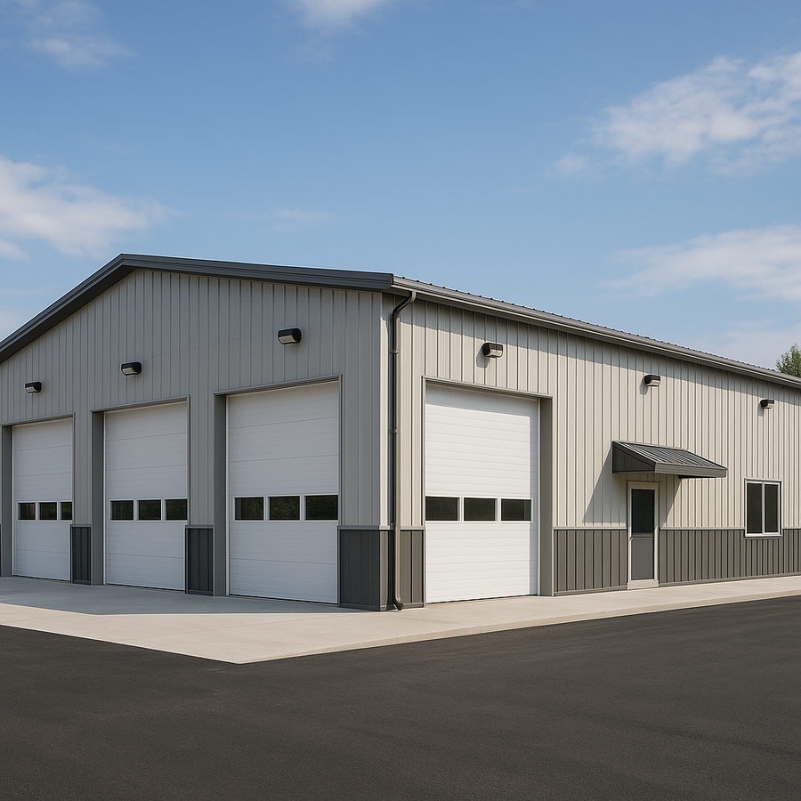 Joshua's 50x70 steel auto shop in Arkansas is optimized for workflow and all-season use, with three insulated overhead doors featuring vision panels, a dedicated walk door under a metal canopy, and side windows for light and ventilation. A durable metal wainscot, full roof and wall insulation, and integrated gutters and downspouts keep this shop clean, efficient, and comfortable.