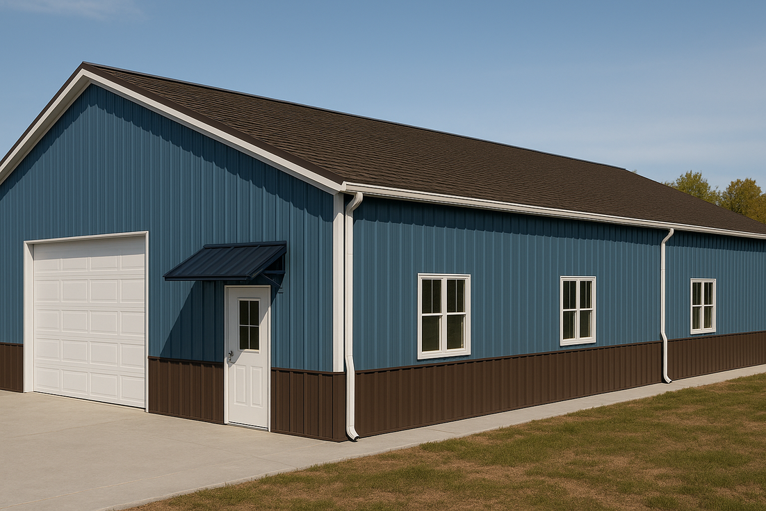 Louis's 56x50 metal building in Colorado is laid out to its full footprint for a spacious, clear-span workspace. Continuous gutters and downspouts manage snowmelt, while a bolt-on canopy keeps the walk door protected. Dark metal wainscot, contrasting upper wall panels, and aligned sidewall windows enhance durability, light, and curb appeal. The bright liner panels and finished slab are ready for R-19 wall and R-30 roof insulation for four-season efficiency.