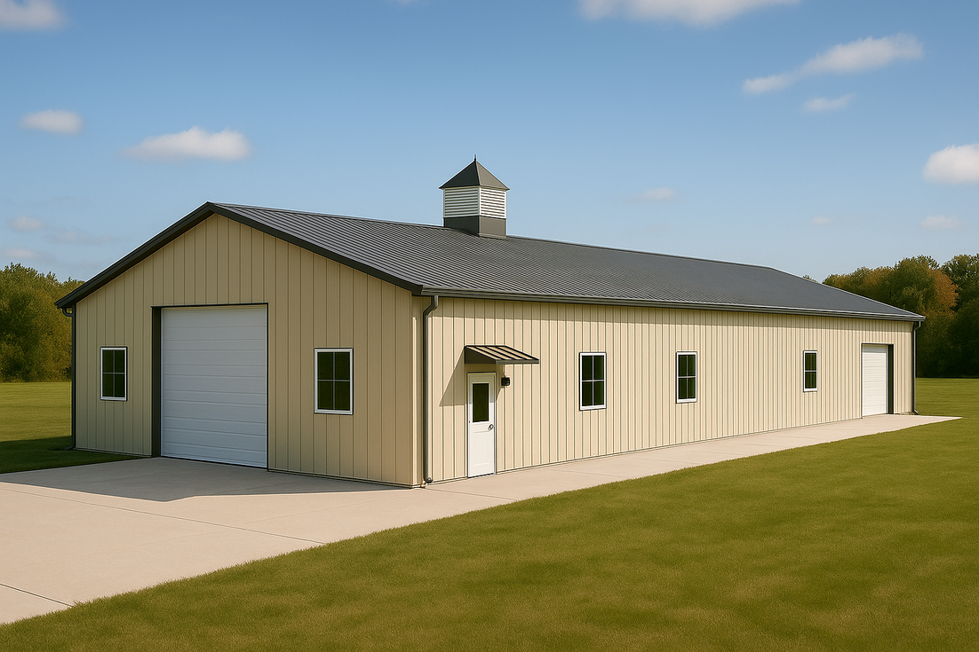 Randy’s 60x100 gable steel building in Indiana is engineered for four-season use with a 1' roof overhang, continuous gutters and downspouts, and concrete aprons that keep entries clear of snowmelt. A mix of 10'x10' and 12'x12' overhead doors, a canopied walk door, and multiple fixed and sliding windows support vehicle access, daylight and cross-ventilation, while optional R-19 wall and R-30 roof insulation improve year-round comfort.