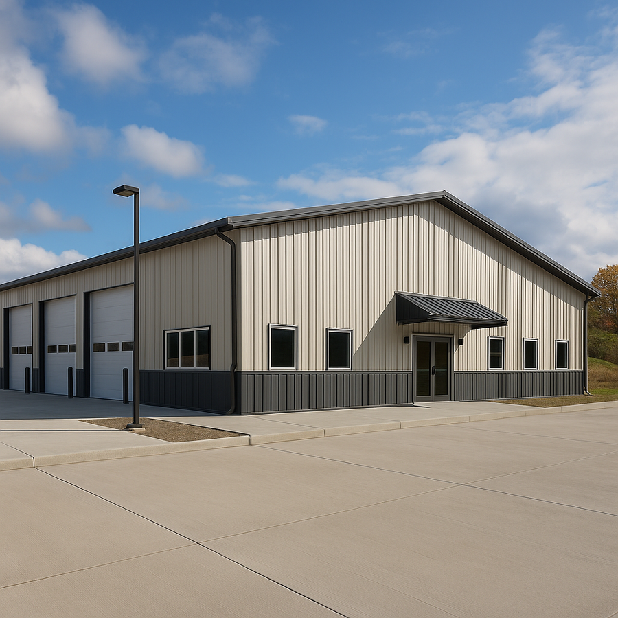 Custom 60x100 steel building kit in Missouri designed for Kurt with a full-length service side, multiple overhead doors, light roof and wall panels, and dark trim with metal wainscot. Features include continuous gutters and downspouts, a bolt-on metal entry canopy, strategically placed windows, insulated wall and roof system with liner ceiling, a broad concrete apron, and exterior site lighting for safe, efficient access.