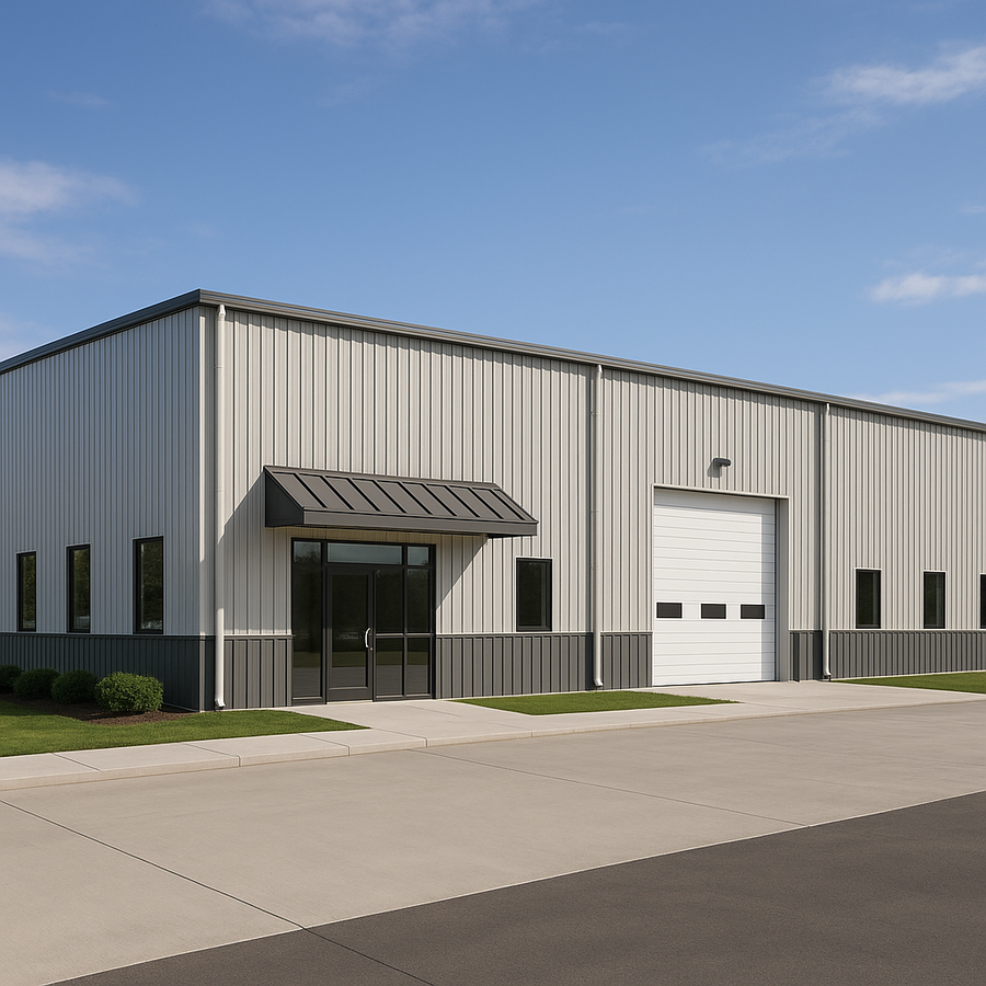 Alexander's 60x120 commercial metal building in California features a durable clear-span frame, tall overhead door for deliveries, and a full glass entry with bolt-on metal canopy. Light wall panels over a dark metal wainscot, continuous gutters and downspouts, and insulated roof and wall panels with multiple windows support efficient, comfortable year-round use.