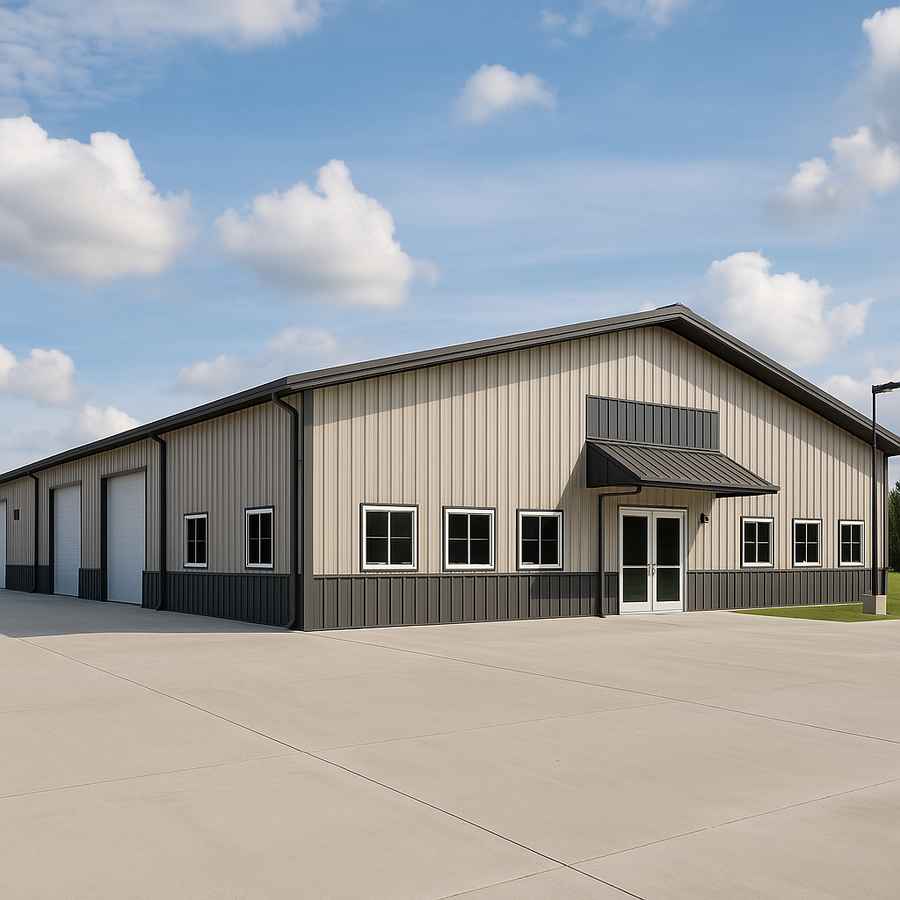 Raymond's 60x120 steel building in Florida is designed for workshop or light-industrial use with a long clear-span interior. The exterior features light wall panels with dark metal wainscot and trim, a glass entry with bolt-on canopy, evenly spaced windows for daylighting, and large sidewall overhead doors opening to a full concrete apron. Continuous gutters, downspouts and optional insulated wall and roof systems help manage weather and keep the space comfortable year-round.