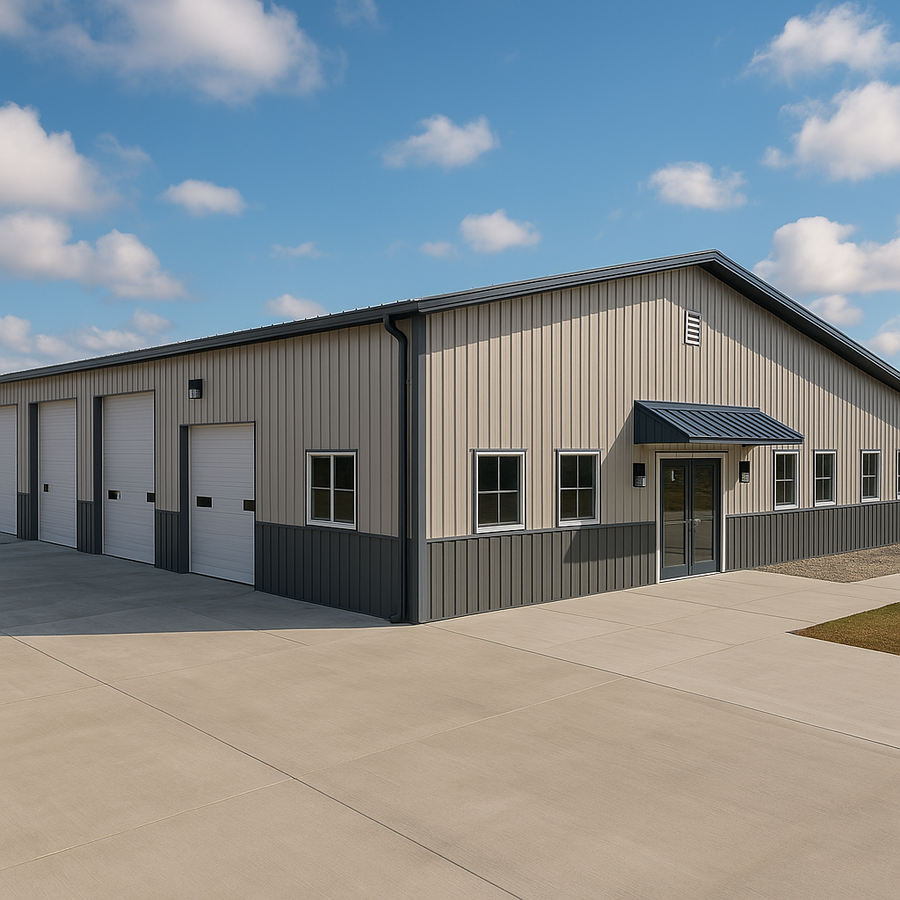 Fernan’s 60x120 metal building in Kansas was designed as a flexible shop and storage hub with a clean commercial look. The 120' elevation features multiple insulated overhead doors along a full concrete apron, durable metal wainscot, and a clearly marked glass entry with a bolt-on canopy. Continuous gutters, downspouts, wall ventilation, liner panels, and future R-11 to R-19 insulation keep the clear-span interior bright, dry, and ready for equipment or build-out.