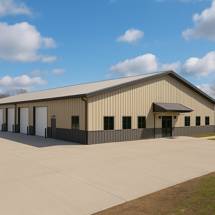 John’s 60x120 metal building in Michigan is detailed for everyday workshop and equipment use. Three large overhead doors on the 60´ side, a metal walk door, and a glazed main entry under a canopy streamline access. Continuous metal wainscot, gutters, downspouts, and recommended wall insulation support a bright, durable, clear-span interior for year-round work.
