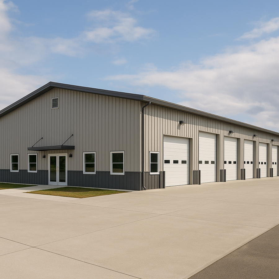 Cade’s 60x120 steel building in Utah is stretched to fit a full shop or fleet footprint, with a row of large insulated sectional doors, a glass-entry storefront under a bolt-on metal canopy, and durable walk doors. High-reflectivity wall panels, dark metal wainscot, and continuous gutters and downspouts create a clean, efficient exterior.