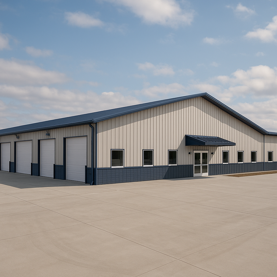 Paul customized this 60x140 metal building in Florida as a flexible shop or light commercial space. The clear-span frame, three large overhead doors and full glass front entry create efficient access, while sidewall windows, a durable metal wainscot, gutters, downspouts and an interior liner system keep the space bright and protected.