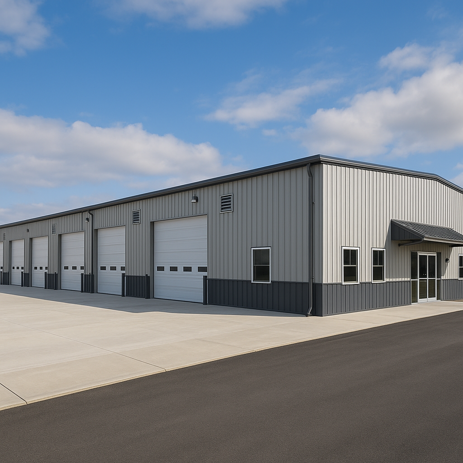 Daniel's 60x160 metal building in Kansas is designed for efficient equipment flow and a bright workspace. The stretched-footprint layout features multiple large overhead doors along the working side, a durable metal wainscot, an office entry with glass storefront and canopy, wall louvers, ample windows, and interior liner panels ready for roof and wall insulation.
