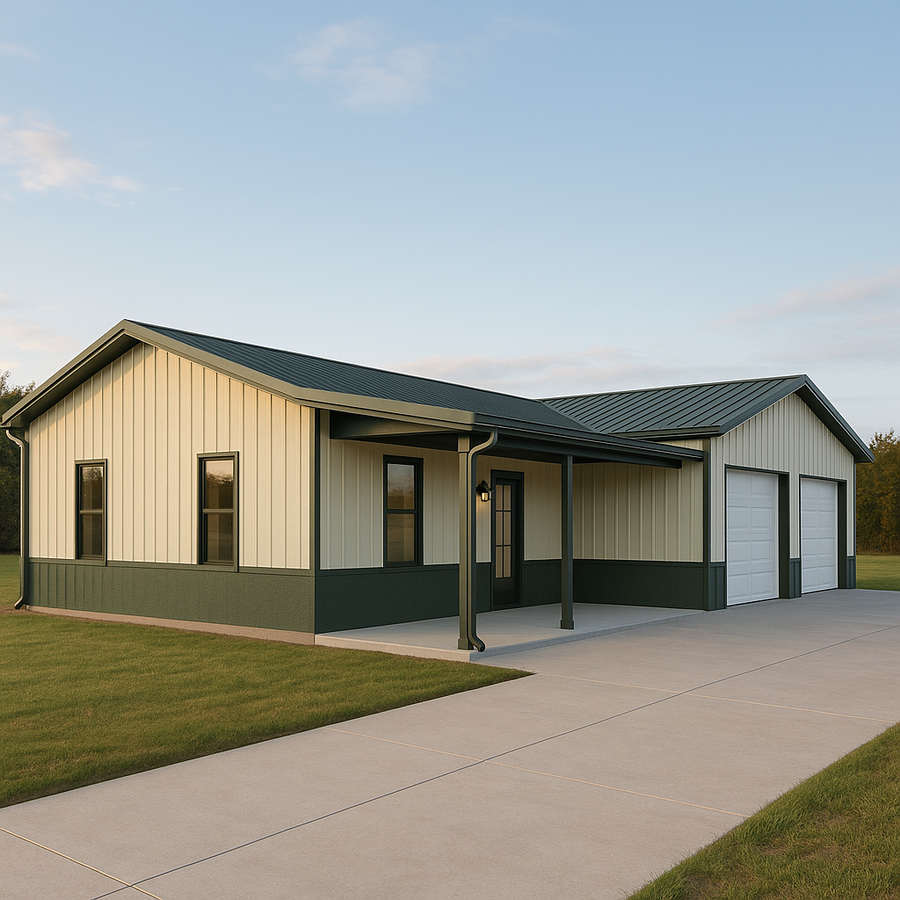 Kaydie’s 60×30 steel home in Oklahoma maximizes its footprint with a full-width garage bay and everyday living space. A covered entry porch with a bolt‑on canopy, gutters, and downspouts protects the slab, while a dark metal wainscot, balanced windows, and insulated walls and roof create a durable, efficient home.