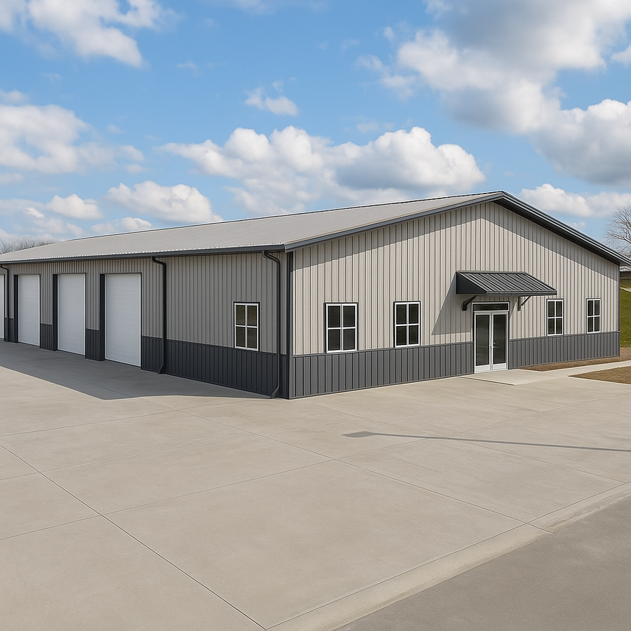 Eric customized this 60x80 steel building in Georgia for everyday shop and office use. Three overhead doors line the service side next to a wide concrete apron, while a glass double door, windows and a metal canopy define the front office. Metal wainscot siding, continuous gutters and downspouts, bright interior liner panels and an insulation-ready roof complete the package.
