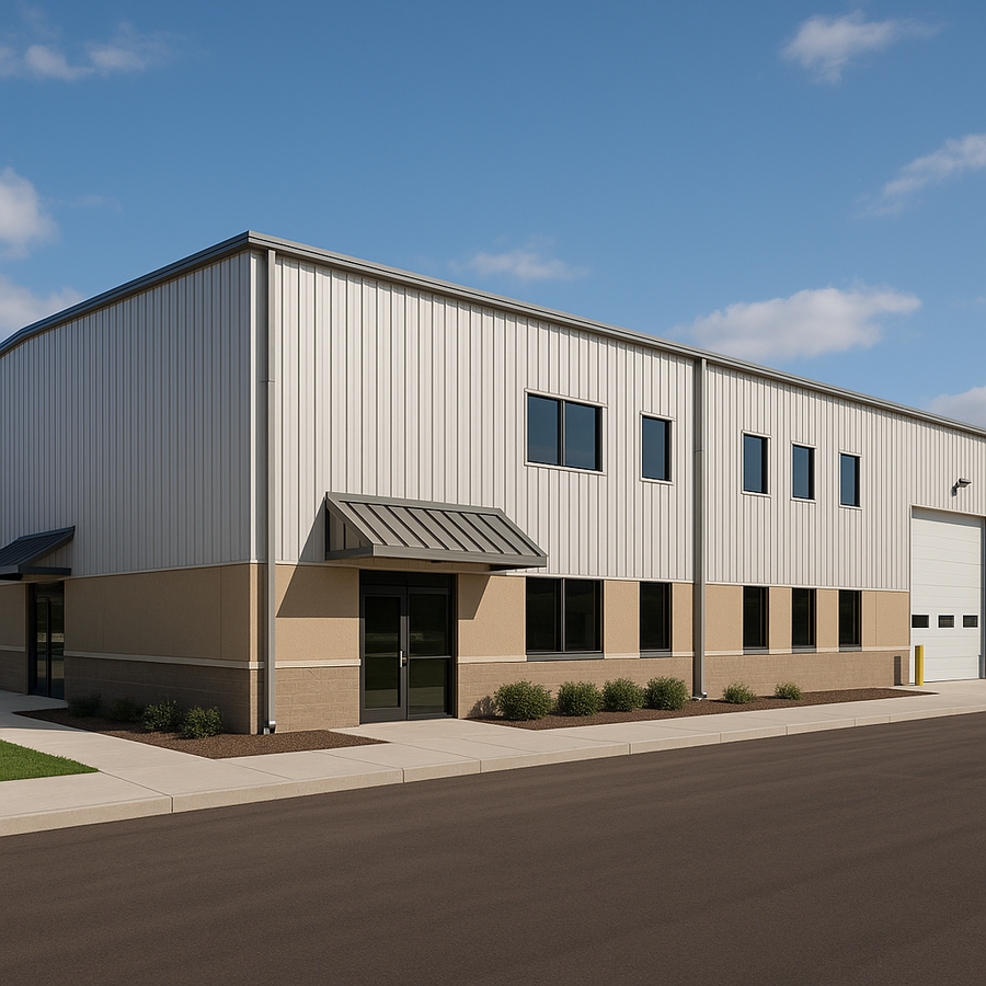 Franco’s 70x160 commercial steel building in Illinois stretches a true commercial footprint with repeated bays, evenly spaced windows, and a protected public entry. A bolt‑on metal canopy, glass entry door, and low painted-metal wainscot create a clean façade, while additional wall windows and a large overhead service door support bright, flexible interior use and efficient circulation.