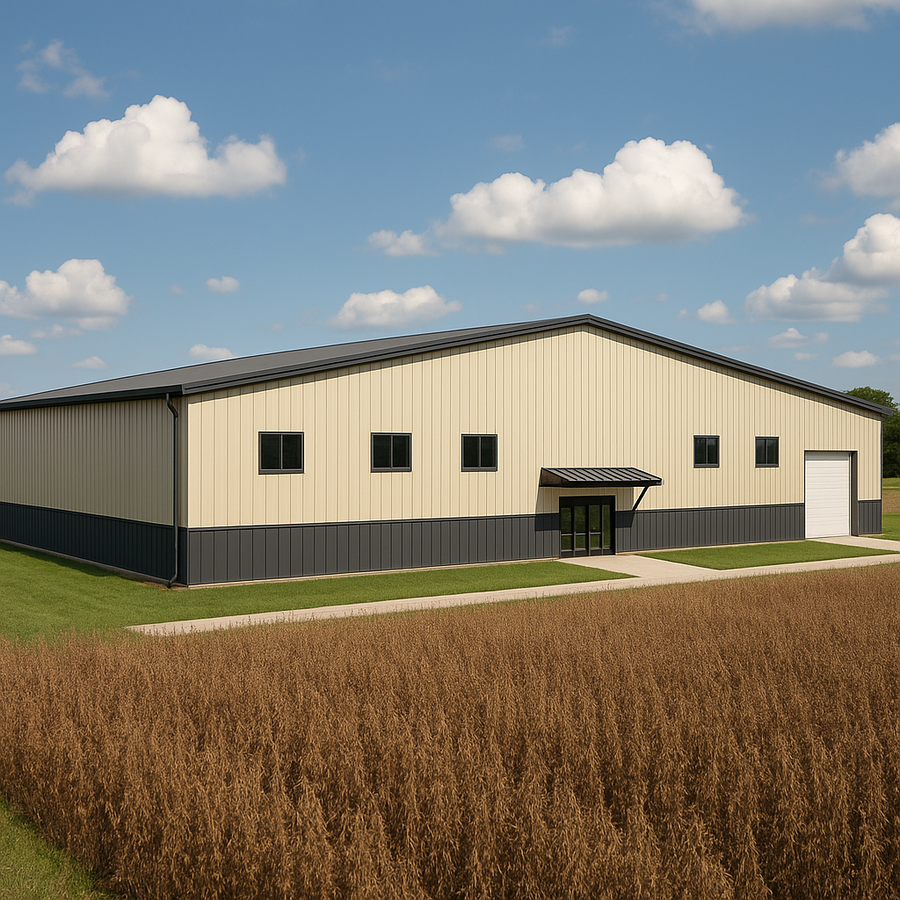 This 80x120 metal sports facility kit in Florida delivers a wide clear-span interior ideal for courts or turf fields. The two-tone steel exterior pairs light wall panels with a dark metal wainscot and trim, plus a covered glass entry, large white overhead door, framed openings for windows, and full gutters and downspouts for controlled drainage.