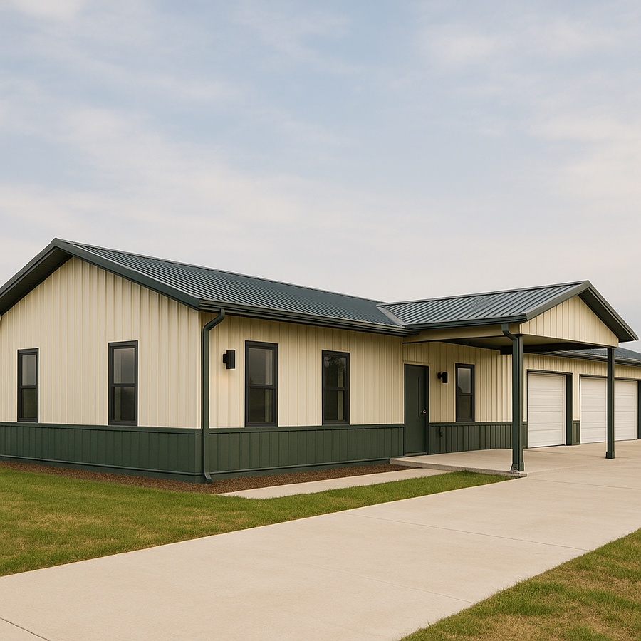 Michael’s 80x40 steel building in Arkansas blends a bright, energy‑efficient living side with a practical garage bay. Continuous gutters, a covered front entry, insulated roof and wall panels, and durable metal wainscot create a comfortable, low‑maintenance space ready for future upgrades.